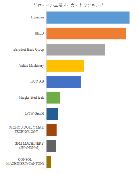 市場の主導権を握るのは、依然として欧州勢である。特にHymmenは高性能連続プレスラインの総合サプライヤーとして首位を維持し、装置の信頼性とアプリケーション対応力で圧倒的な存在感を示す。続くHELDは、家具・建材向け用途で強く、カスタムラインの設計力を武器としている。Bemdorf Band Groupはスチールベルト技術を核に、食品、化学、木材など幅広い分野に展開し、顧客基盤を拡大している。