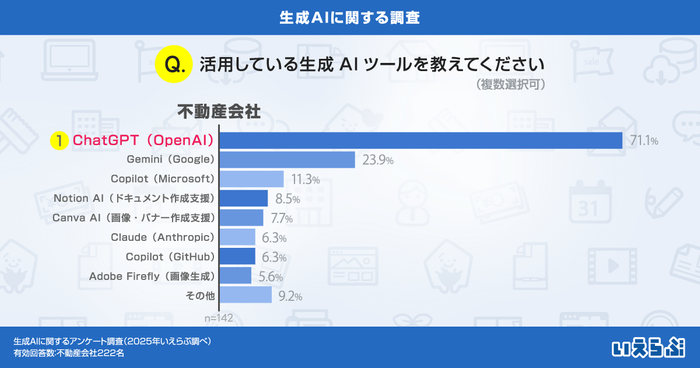 次に、「Gemini(Google)」が23.9%、「Copilot(Microsoft)」11.3%となっており、ChatGPT(OpenAI)の認知度の高さや導入のしやすさが、不動産業界でも広く受け入れられている要因と考えられます。