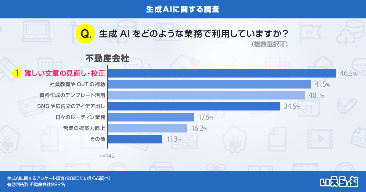 生成AIを利用したことがある不動産会社(※2)に「生成AIをどのような業務に利用していますか?」と聞いたところ、最も多かったのは「難しい文章の見直し・構成」で46.5%、次いで「社員教育やOJTの補助」が41.5%、「資料作成のテンプレート活用」が40.1%という結果でした。