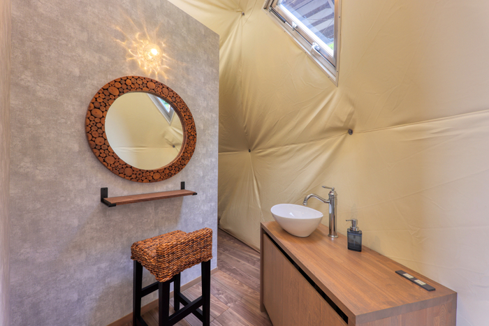 テント内には、ホテル並みに充実した設備と温水洗浄機能付きトイレとシャワールームが備え付け。
