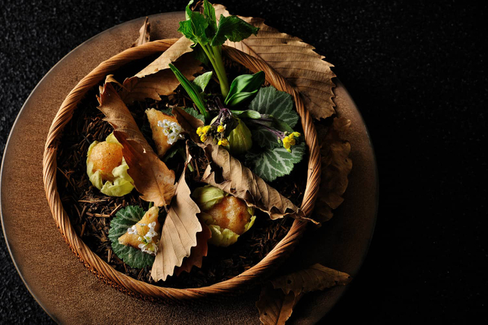 五味(酸・塩・苦・辛・甘)をそれぞれ小さな料理に詰め込み、繊細な技術で表現した星のや東京総料理長 浜田 統之の代表的な料理の一つです。料理の味付けには、しば漬けや塩辛といった日本で古くから親しまれてきた発酵食品を使用しています。えんどう豆の風味と甘みを感じることのできるえんどう豆味噌、豆腐を麹につけ、塩水で発酵させた腐乳、鯖のぬか漬けといった、フレンチでは珍しい発酵食品も取り入れています。