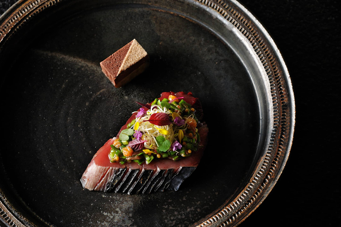 春先から水揚げされ、さっぱりとした赤身が特徴の初鰹を藁焼きにした一皿です。皮目を炙り、米麹醤とごま油でマリネした初鰹に、香り高く柔らかい春のにらと、発酵食品の酒盗とたまり漬けマスタードをあわせたソースをのせています。藁焼きにすることで、旨味が閉じ込められた鰹には、にらのソースがよく合います。また、鮮度が落ちるのが早いため、普段は捨てられてしまう鰹の血合いを使った、鰹のブーダンノワール(フランス料理で、豚肉の血と脂で作られる腸詰めの一種)も添えました。野菜と一緒に火を通した鰹の血合いを、ハーブとあわせ、オーブンで蒸し焼きにしています。