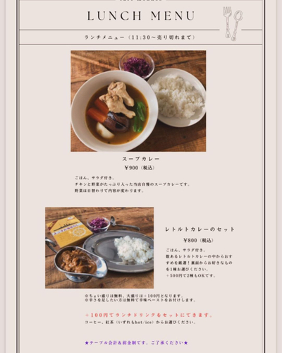 カフェモッコスは、缶詰バーをランチ間借りしており、名店のレトルトカレーも充実しています。店主自慢のスープカレーと名店レトルトの食べ比べもぜひお楽しみください。