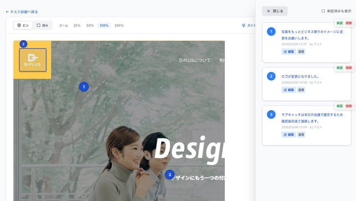 画像・PDF上に直接ピンや囲いでコメントを付けられます。「左上のバナー」など言葉で説明する必要がなくなり、修正指示が一目で伝わります。