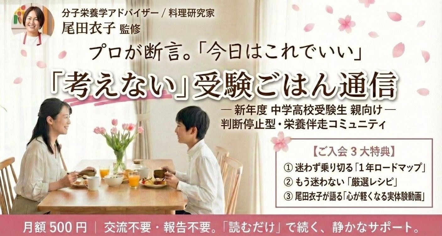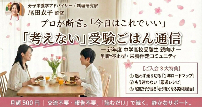 新年度の受験シーズン本格始動を前に、保護者の「毎日の食事判断」という精神的負担を軽減する新しい家庭教育支援モデルが始動します。料理研究家として20年のキャリアを持ち、テレビ・雑誌等で幅広く活動する尾田衣子(分子栄養学アドバイザー)は、親の判断ストレスを最小限に抑えることに特化したオンラインコミュニティ「考えなくていい受験ごはん通信」を開設。現在は新年度受験生に向け、情報過多で疲弊する家庭の“判断疲れ”を解消する新しい支援インフラとしての有効性を検証する「実証フェーズ」として展開しています。