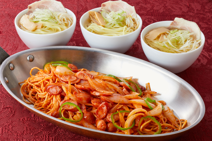 スパゲッティナポリタン、夜鳴きそば、キャベツ焼き、チーちく磯部揚げ、じゃがいもコロッケ、ポークチョップなど