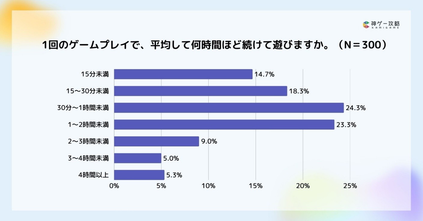 1回のゲームプレイで続けて遊ぶ時間は、30分〜1時間が24.3%で最多となりました。