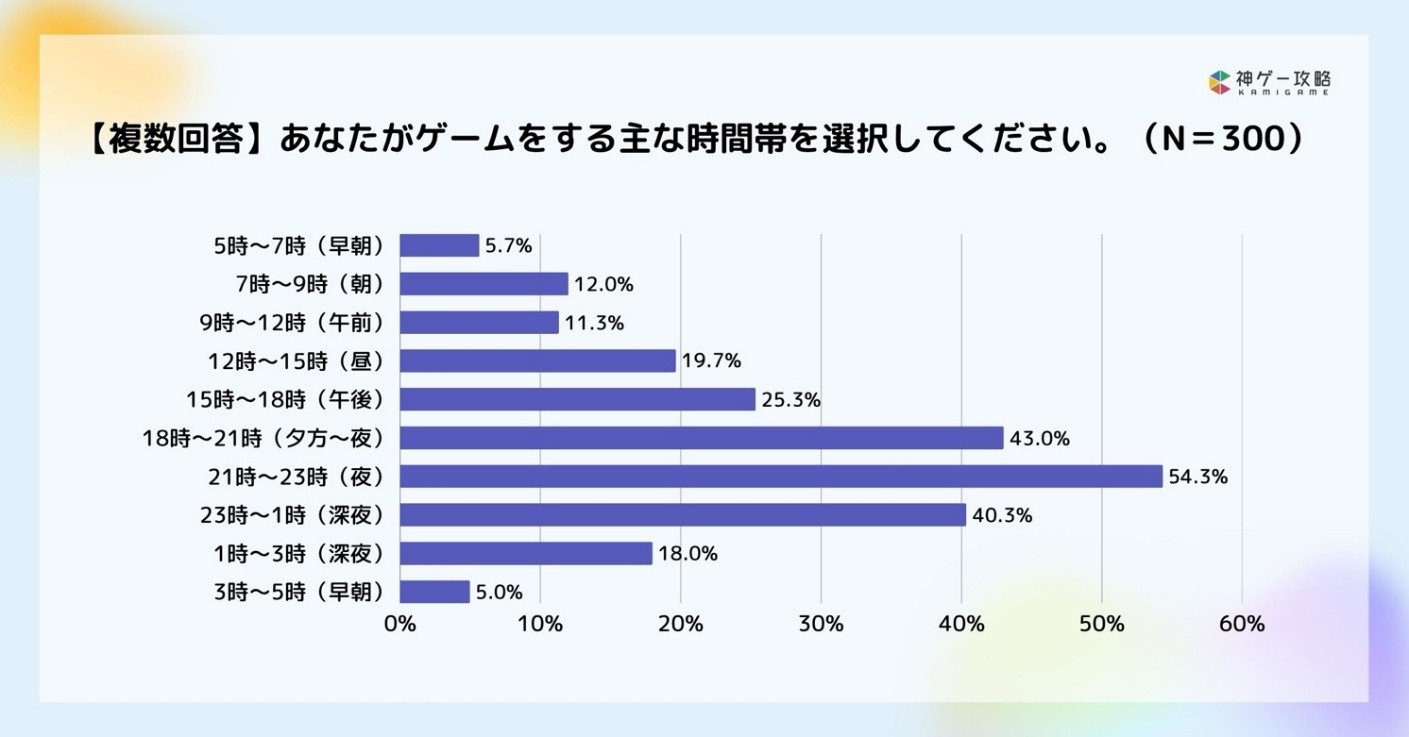 ゲームプレイする時間帯の調査では、21〜23時が54.3%で最多の結果となりました。