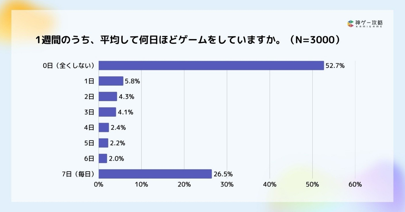 1週間のうちにゲームをプレイする日数は、7日が55.3%で半数を超え、過半数以上のゲームユーザーが毎日ゲームをプレイしていることが分かりました。