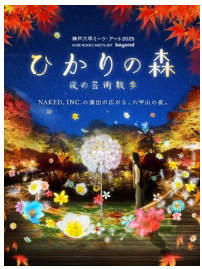 夜間限定の光のアート作品が、ROKKO森の音ミュージアムと六甲高山植物園を幻想的に彩ります。また、会場に設置された作品が光に照らし出され、昼間とは違った表情をお楽しみいただけます。10月中旬~11月中旬には、ライトアップされた木々の紅葉もお楽しみいただけます。