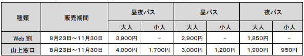 【料金】上記、夜パスまたは昼夜パスのとおり