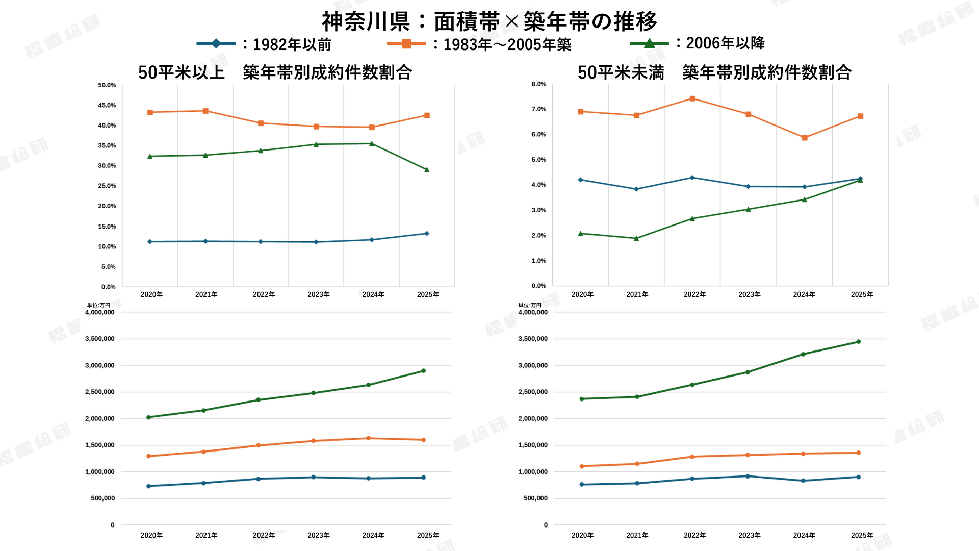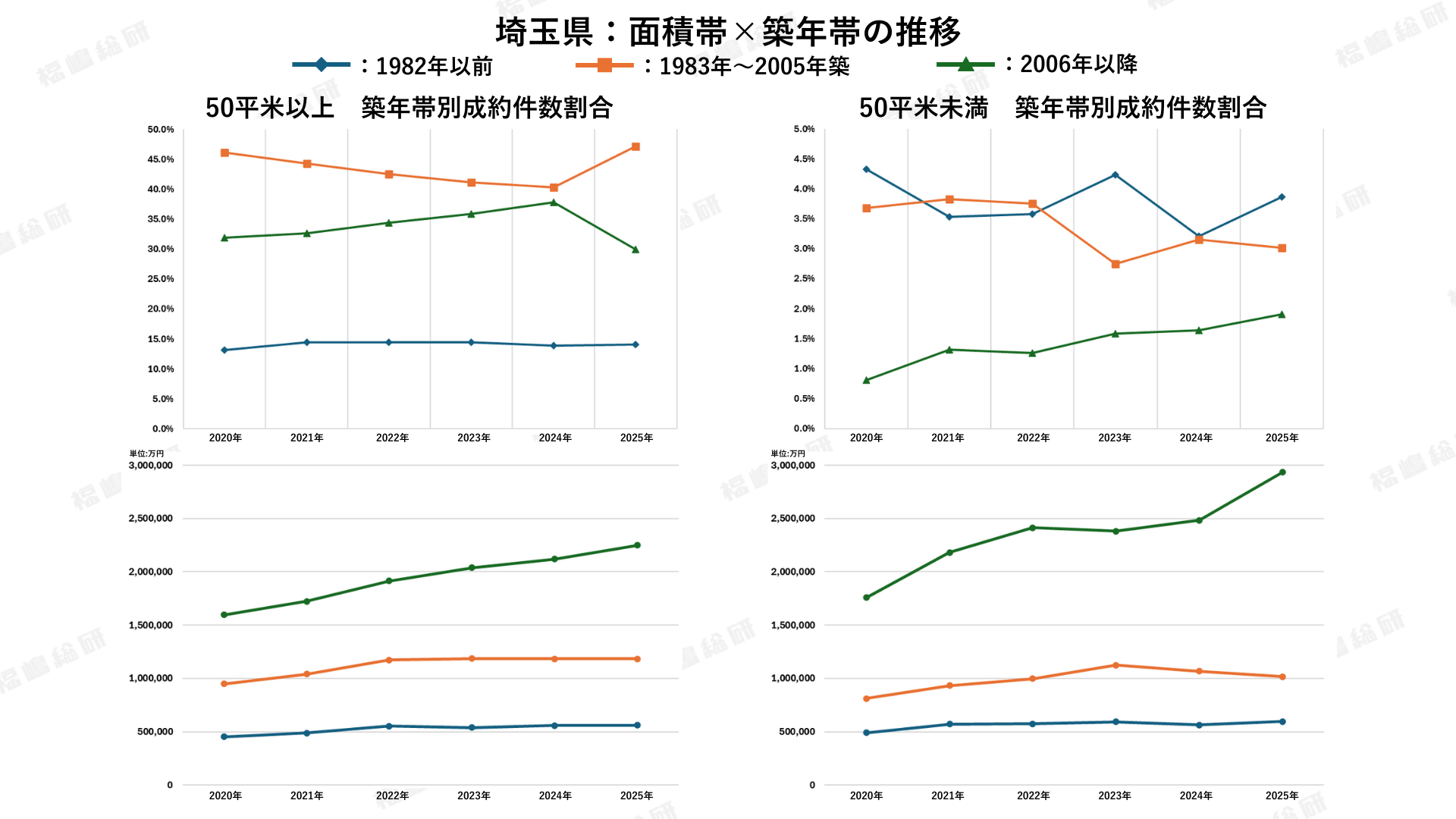 2025年は、東京都・周辺3県のいずれにおいても、築年が浅く、かつ面積が広いマンションの成約件数割合が減少し、それに代わるセグメントが台頭した一年でした。