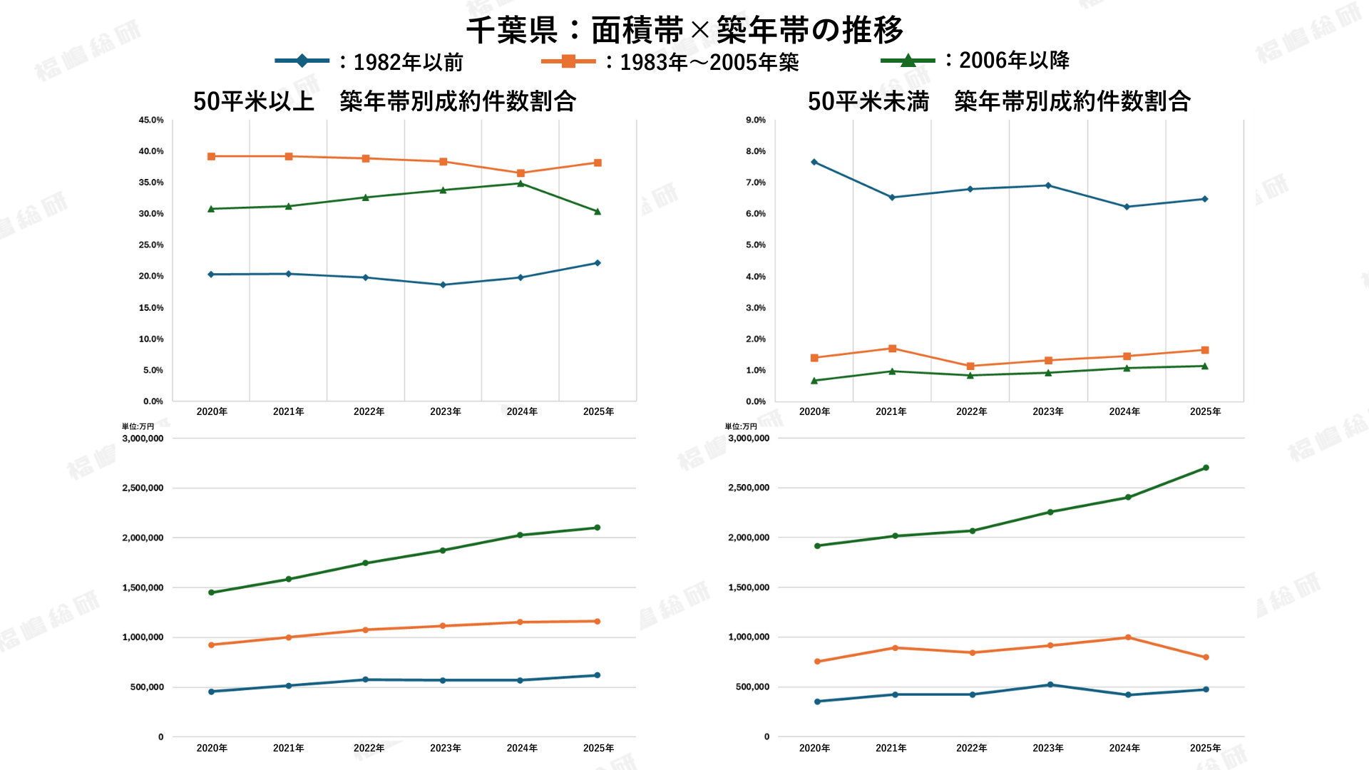 周辺3県(埼玉県・千葉県・神奈川県)の成約坪単価の推移を見ると、面積の大小にかかわらず、2006年以降築のセグメントのみが価格上昇しており、1982年以前築、1983年~2005年築のセグメントでは横ばい、もしくは下落傾向が確認できます。