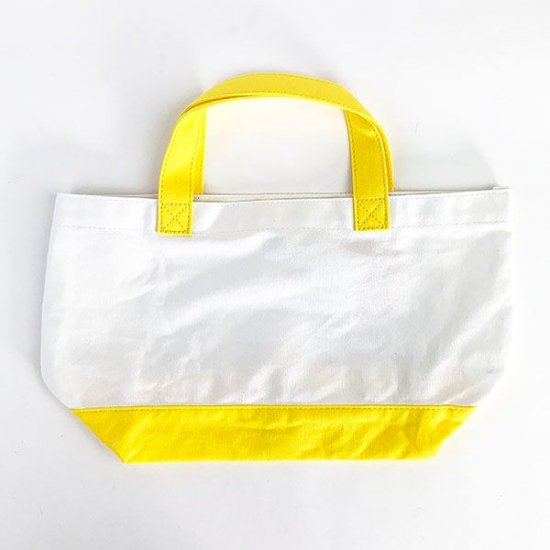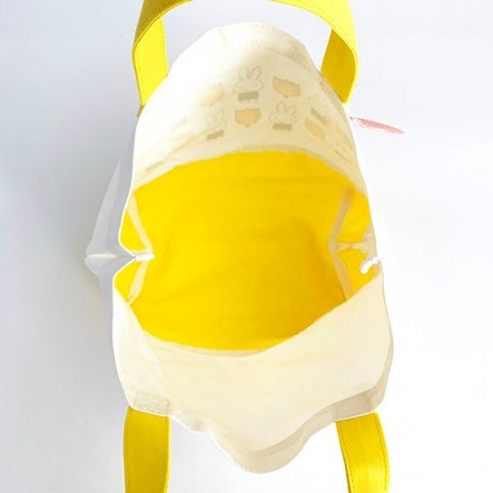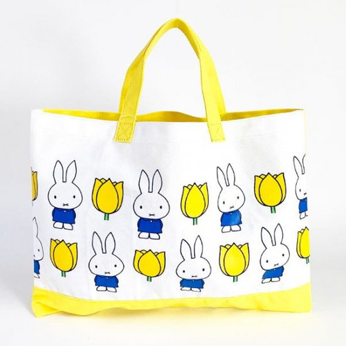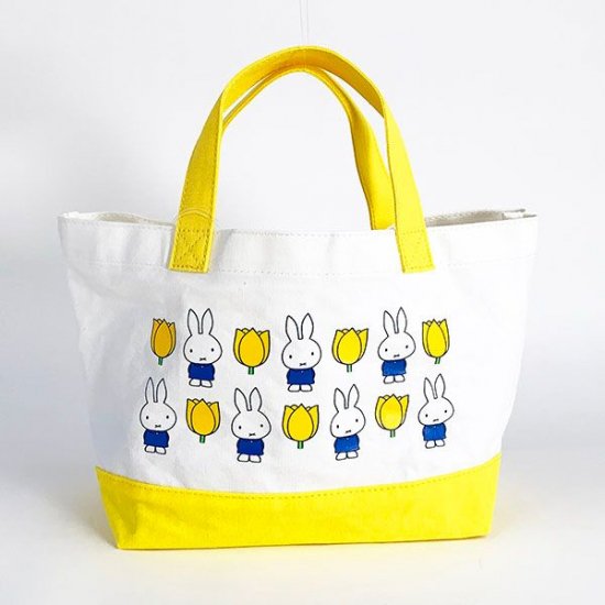 デイリー遣いに大活躍のサイズで登場の、ミニトートバッグです。キャンバス地に底と持ち手がイエローになっていて、カラフル♪さらに、ブルーのお洋服のミッフィーとイエローのチューリップの対比がとってもきれいなんです。