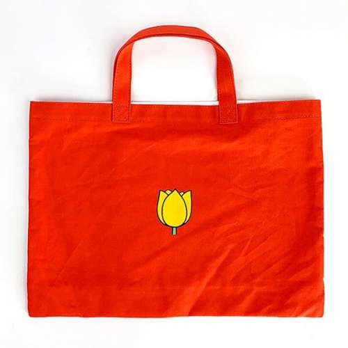 反対側は、赤い背景に一輪の黄色いチューリップのデザイン。