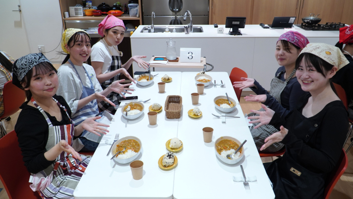 防災クッキングでは、ポリ袋を使ってごはん、ツナカレー、バナナチョコチップ蒸しパンを作りました。災害時の状況を踏まえたランタン光のみの調理作業、ポリ袋調理に適した材料の切り方、ポリ袋の縛り方など、万一の時に必要となるノウハウを身に着けることができました。
