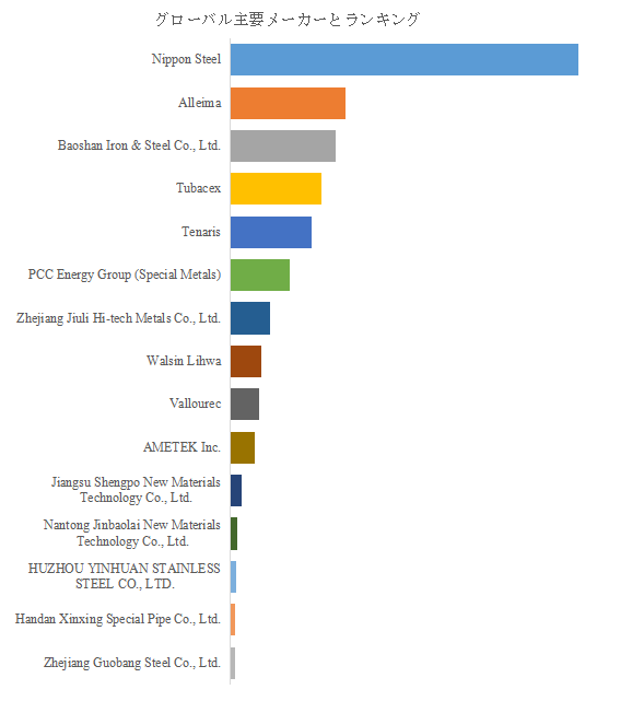 LP Informationのトップ企業研究センターによると、世界のニッケル合金チューブ市場では、Nippon Steel、Alleima、Baoshan Iron & Steel Co., Ltd.、Tubacex、Tenaris、PCC Energy Group(Special Metals)、Walsin Lihwa、Zhejiang Jiuli Hi-tech Metals、Vallourec、AMETEK Inc. といった企業が主要製造者として位置付けられている。2024年の売上ベースではトップ5企業が約47%、トップ10企業が約57%の市場シェアを保持しており、一定の集中度を持ちながらも複数プレイヤーが機能している市場構造である。各企業はそれぞれ強固な冶金技術と製造プロセスを基盤に、高耐久材料の供給力を展開していることが特徴である。特に、合金設計技術、管材製造ノウハウ、品質管理システムといった要素が競争の中心となり、各社は専門分野での差別化を通じて市場ポジションを強化している。こうした企業群の存在が、グローバル市場の安定供給を支え、製品性能の高度化を牽引する原動力となっている。
