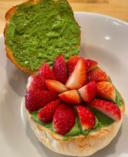 いちご抹茶クリームバーガー」はバンズの内側に抹茶クリーム、そこにたっぷりのいちごを盛りつけ、さらにクラウンの上から自家製のストロベリーソースを垂らしかけています。期間限定品ですので、お早めに!