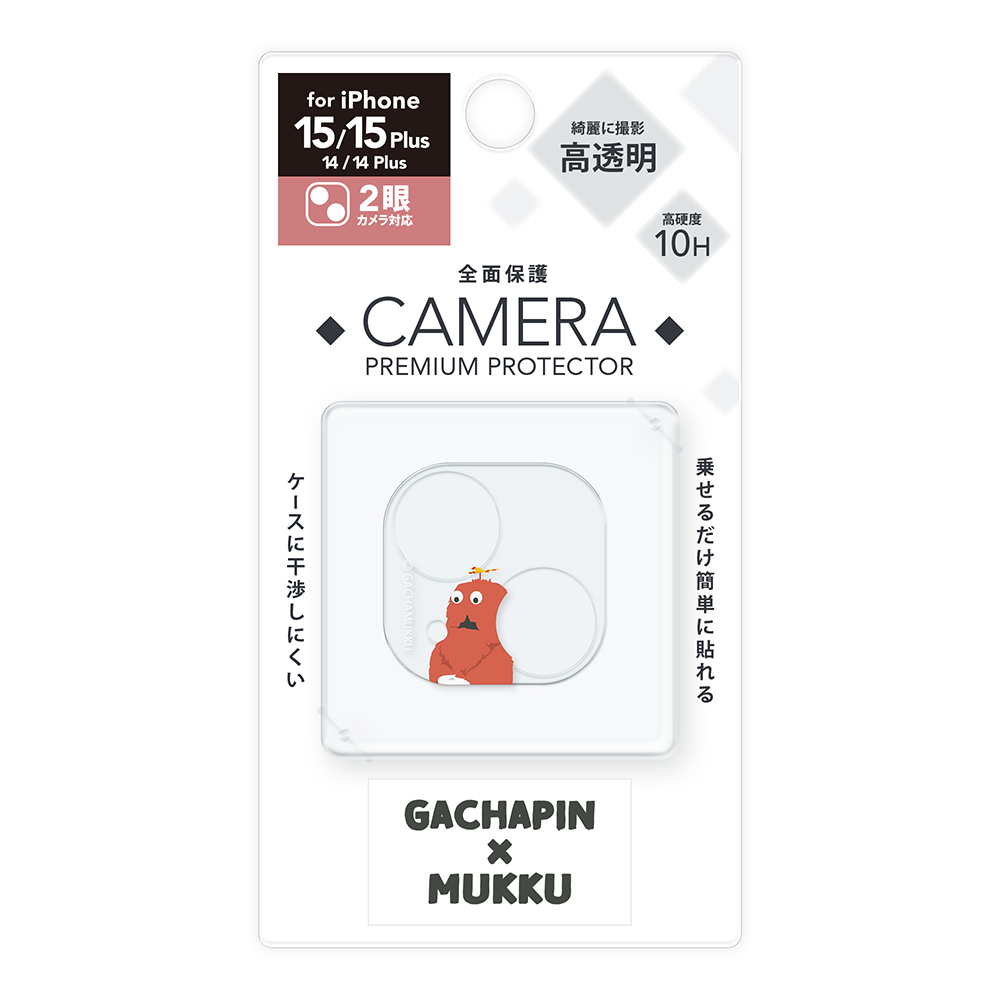 「ガチャピン・ムック」デザインのiPhone 15/15 Plus/14/14 Plus用カメラフルプロテクターです。本体カラーを活かすクリア仕様。表面硬度10H光沢ガラスと耐候性に優れたアクリル素材で一体成形されており、端末本体のカメラレンズ周りからLEDライト部までキズを付けず、美しくカメラレンズ守ります。