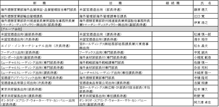人事異動のお知らせ 宝ホールディングス株式会社 2024-03-26 10:00 宝ホールディングス株式会社およびグループ会社では、2024年4月1日付で人事異動をおこないます。 ◆宝ホールディングス株式会社 【人事異動】 ◆宝酒造株式会社 【人事異動】 ◆宝酒造インターナショナル株式会社 【人事異動】 ジャンル: BtoB・ビジネス 画像一覧 一括ダウンロード