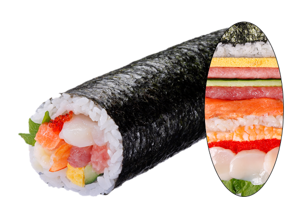 えびやいか、たこ、サーモン、たたきまぐろなどの人気の海の幸がたっぷり入った海鮮太巻です。
