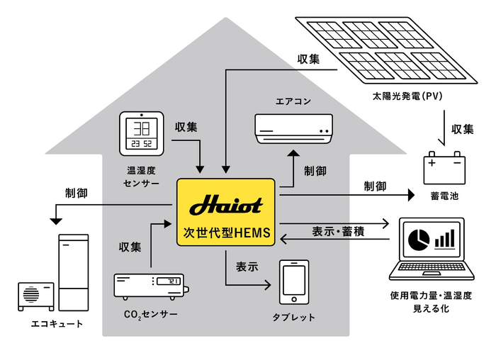 solanesは、独自開発のAIを搭載したHEMS(Home Energy Management System):Haiot System(ハイオシステム)を用いて、住宅におけるエネルギーの「見える化」「最適化」「自動制御」を実現するサービスを展開しています。太陽光発電、蓄電池、エアコン、エコキュートなどの設備と連携しながら、AIによる自動制御技術を活用し、エネルギーの無駄を減らして、家計にも地球にもやさしい暮らしをサポートします。