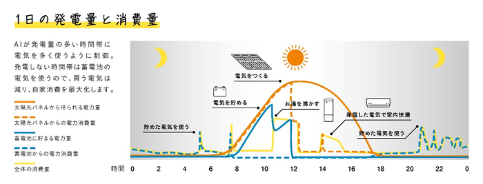 ここ数年上昇傾向にある電気代。solanesを導入すると、独自のAIを搭載したHEMSの自動制御により、従来の自家発電システムよりさらに電気代を削減します。太陽光で発電した電気を最大95%自家消費(*1)するため、年間の電気代も1/4まで削減できます(*2)。これらの削減率や電気の最適化の様子を誰が見てもイメージしやすいように掲載しました。