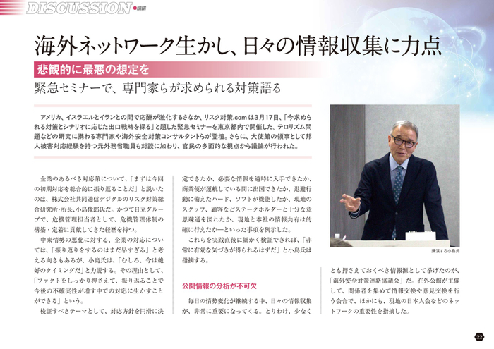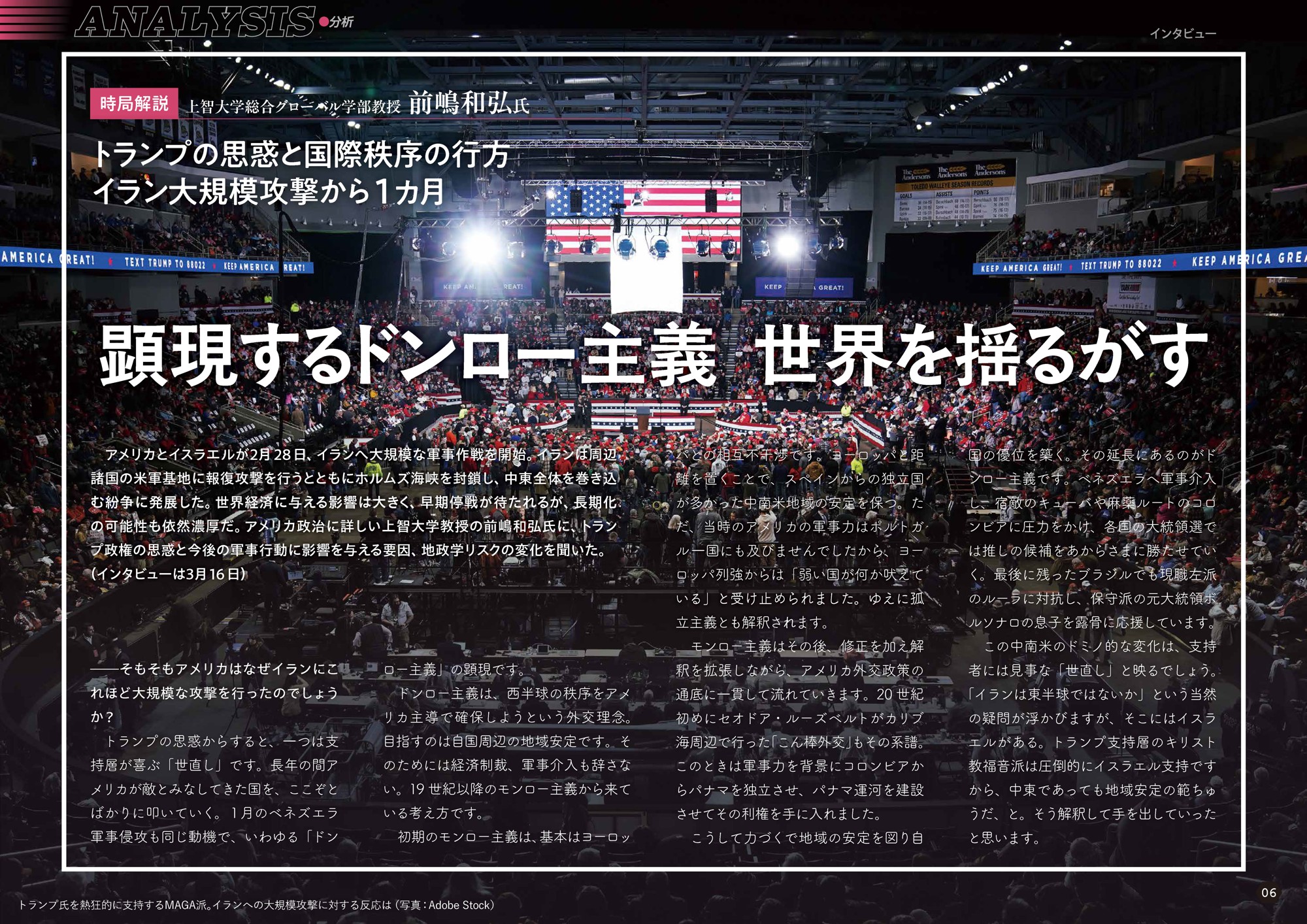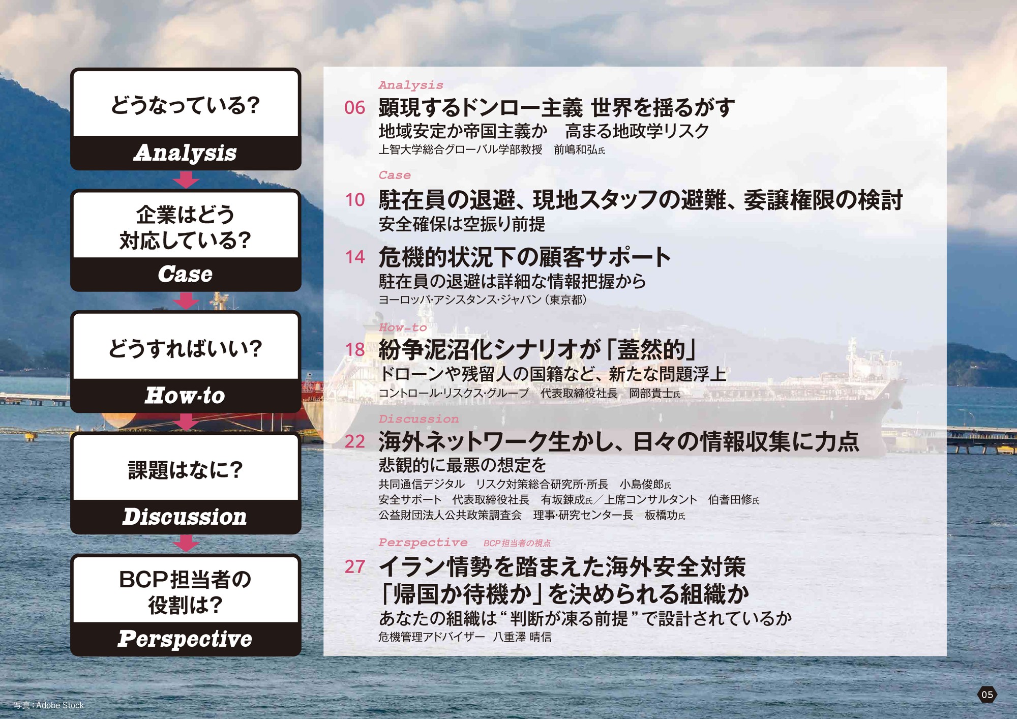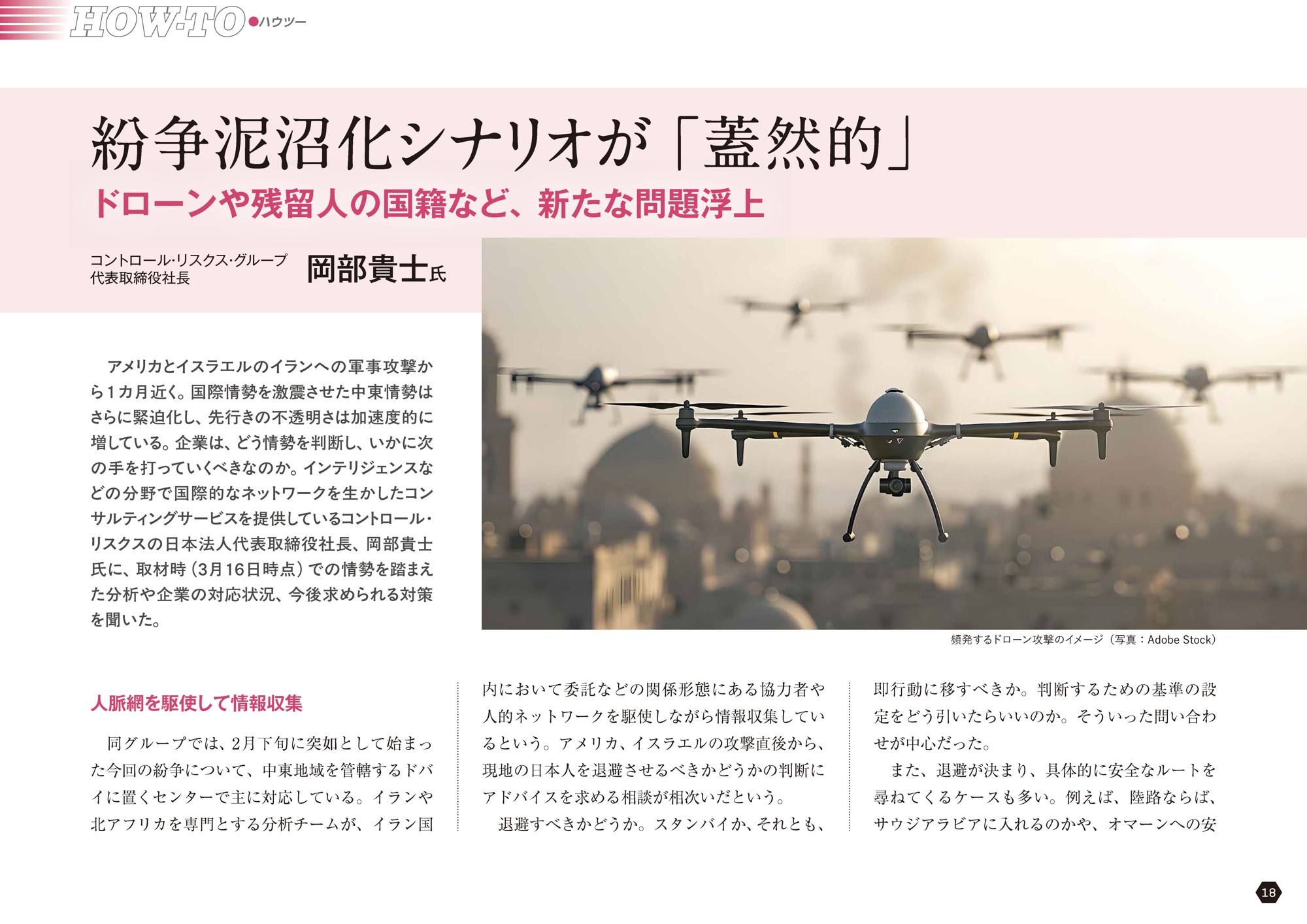 今号では中東からの緊急退避を巡る企業の実態と支援組織が果たす役割を追った。双方の攻撃は断続的に続き、ホルムズ海峡は事実上封鎖されたまま。4月2日のトランプ大統領会見でも特段の収穫はなく、事態はさらなる長期化の様相を見せている。