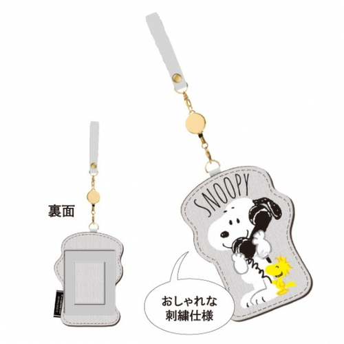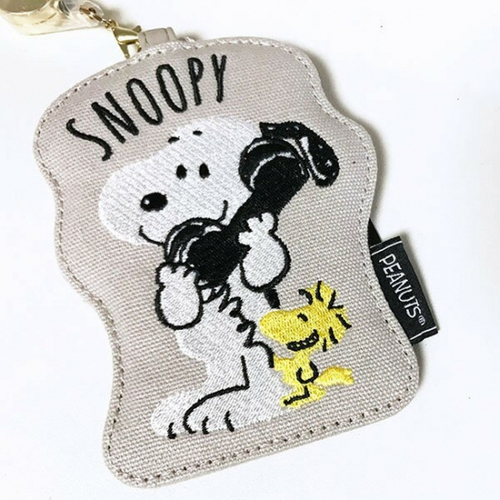 刺繍が可愛いパスケースもご紹介♪誰と電話をしているのでしょうか。ウッドストックもコッソリ会話を聞いていますね♪