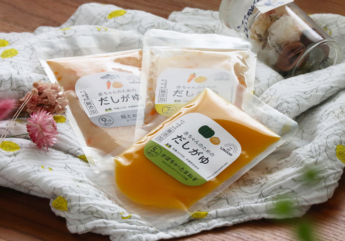 赤ちゃんのためのだしがゆシリーズは、国産有機野菜、新潟県産有機米にこだわりのだしを合わせた、だし専門店ならではのだし粥です。離乳食のステップアップができるよう、月齢別に素材の大きさ、米の固さ、だしの種類や濃さを変えて3種類ラインナップしました。袋を開けてそのまま食べられるので、忙しいママ・パパの離乳食づくりのサポートや、外出時にも使えるレトルト商品です。パッケージは出産祝いやお家に訪問する際のプチギフトにも選んでいただきやすい可愛らしいデザインに仕上げておりますので、プレゼントにもおすすめです。