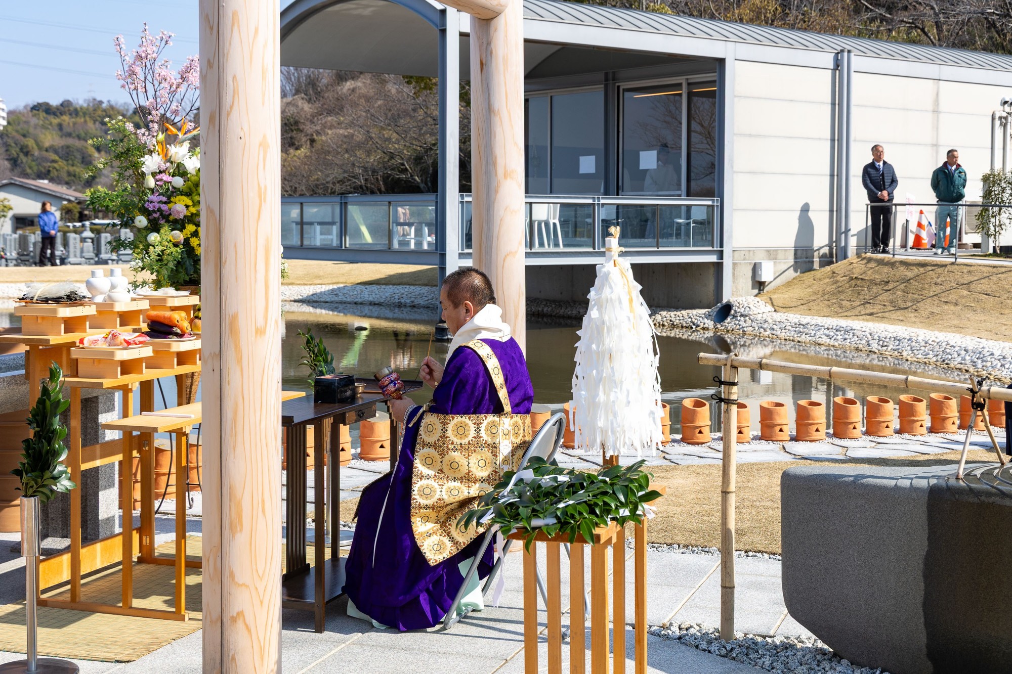 祭祀では、大光山不動院和尚による読経が行われ、続いて神職による祝詞奏上により御霊を鎮めます。神仏それぞれの専門家が共に祈りを捧げる荘厳な光景は、ご契約者様からも「これ以上ない手厚い供養」として深い信頼をいただいております。