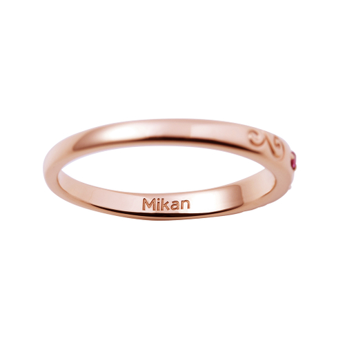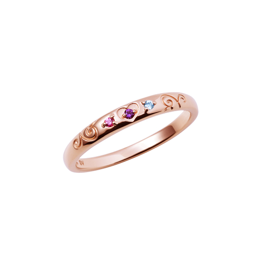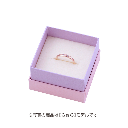 ピンクゴールドコーティングで表現した甲丸フォルムの表面には、ガァルマゲドンのチームロゴから模様を取り込み3石のカラーストーンをセット。内側にはキャラクター名の刻印を施しました。