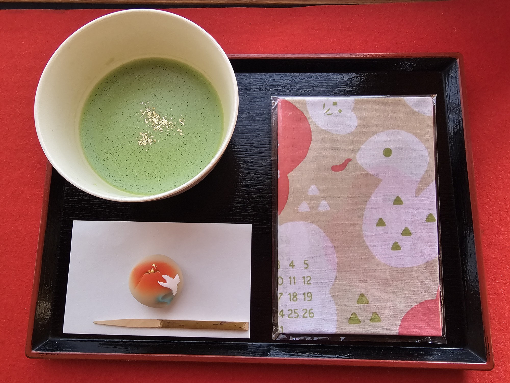 ・開運金箔お抹茶セット干支手ぬぐい付 2,500円(2025年の干支「巳」のカレンダー手ぬぐいがついたセット)
