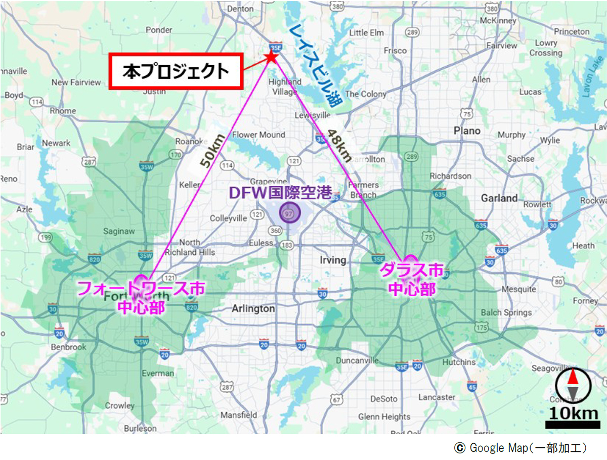 本プロジェクトの計画地は、ダラス市の中心部から北西へ、またフォートワース市の中心部からは北東へ、それぞれ50kmほど離れたコリンス市にあります。周辺には商業施設や学校、病院などが揃い生活利便性が高く、かつ豊かな自然も享受できる住宅地として人気のあるエリアです。高速道路の出入口も近く、ダラス市やフォートワース市のビジネス中心地までは車で約40~50分とアクセスが良いため、そこに通勤する方々の住宅需要が見込まれています。