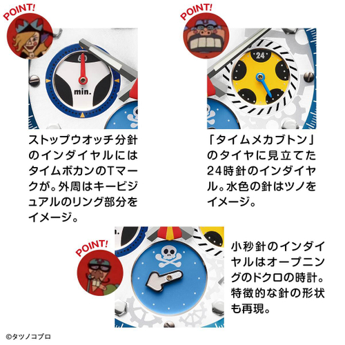 ストップウオッチ分針のインダイヤルには、タイムボカンのTマークをデザイン。「タイムメカブトン」のタイヤに見立てた24時針のインダイヤル。小秒針のインダイヤルはオープニングのドクロの時計をイメージ。