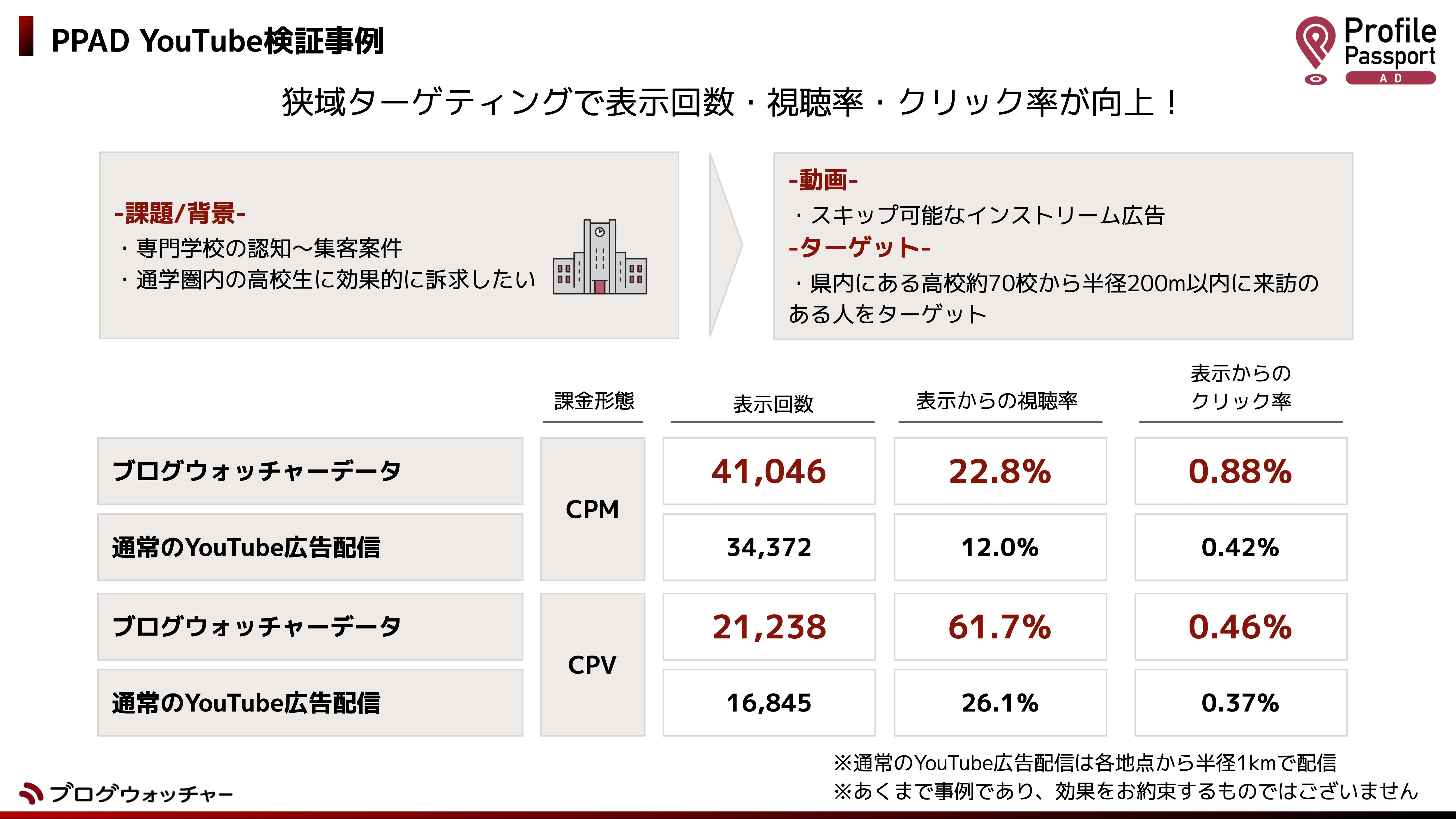 位置情報データを用いた広告・分析サービス「プロファイルパスポート」を提供する、株式会社ブログウォッチャー(本社:東京都中央区、代表取締役:酒田 理人、以下「ブログウォッチャー」)は、位置情報ターゲティング広告サービス「プロファイルパスポートAD(以下「PPAD」)」の配信面に、新たに「YouTube」を追加しましたことをお知らせいたします。従来の高精度なエリアターゲティング機能を動画広告配信に活用することで、より幅広いユーザーに向けた、効率的なマーケティング活動を支援するための取り組みを進めてまいります。