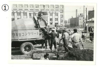 この写真群は、昭和30~35年に行われた日比谷公園の地下駐車場工事の様子(①)と、その工事