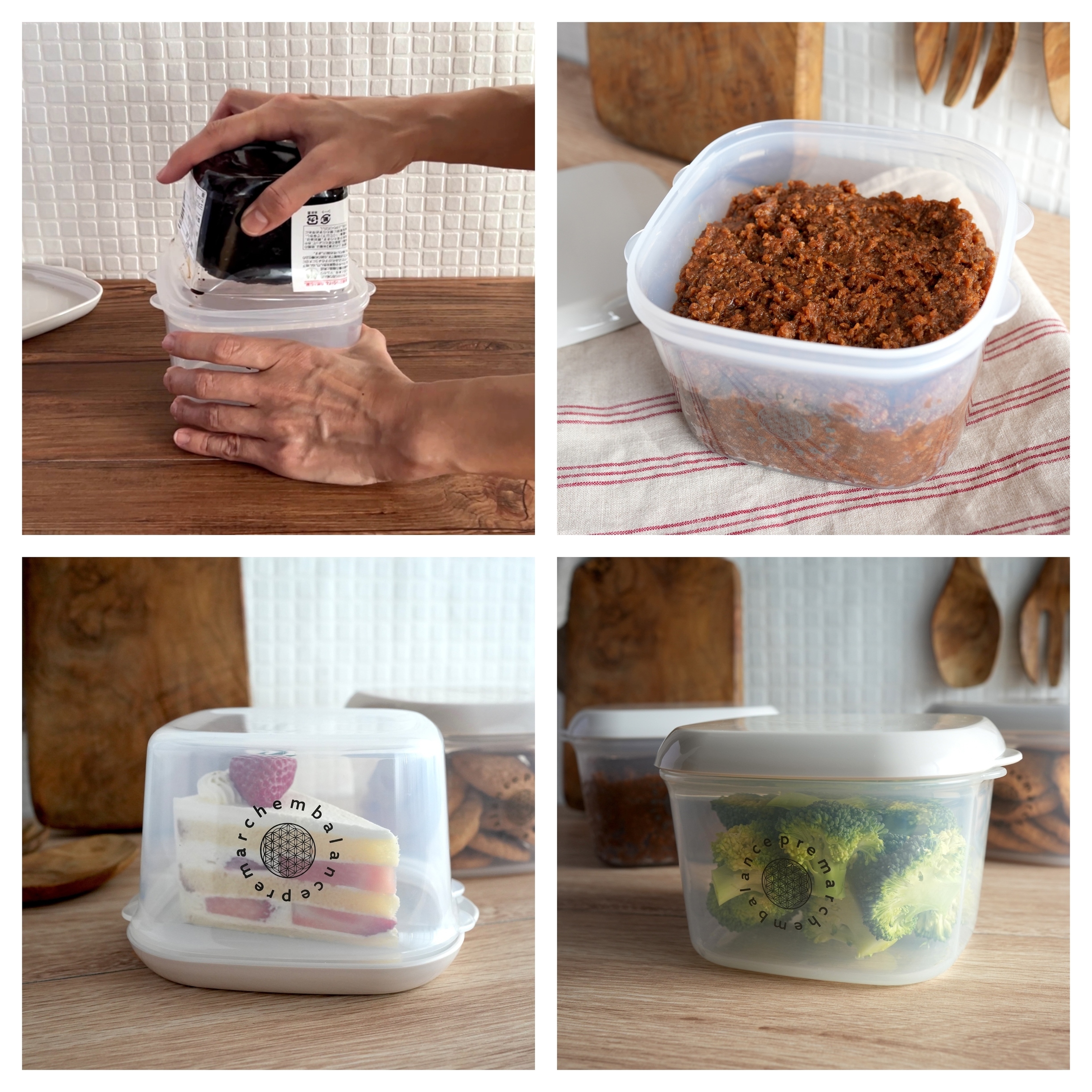 本製品は、一般的な味噌のひとパック分(1kgまで)の味噌を収納できるサイズ感と、冷蔵庫内の収納効率を最大化する立方体のフォルムが特長です。味噌のほか、高さのあるケーキやおかずなどの保管にも、幅広くお使いいただけます。エンバランス加工により、新鮮さとおいしさをしっかりキープします。