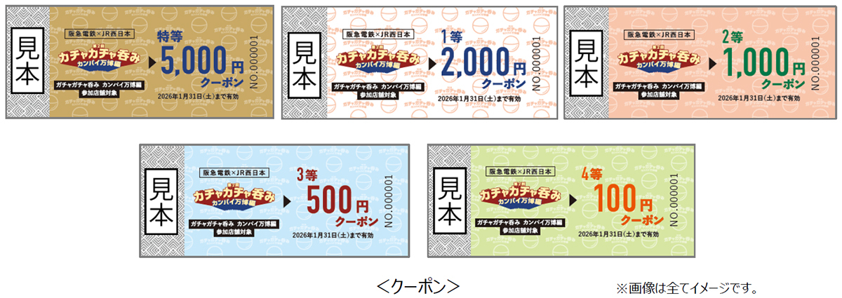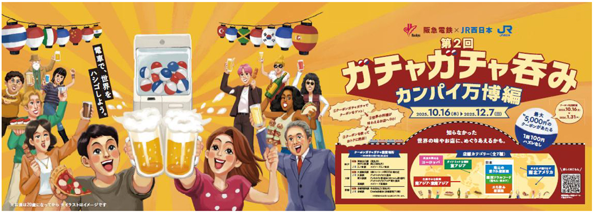 阪急電鉄株式会社(以下、阪急電鉄)と西日本旅客鉄道株式会社(以下、JR西日本)では、両社沿線の飲食店で利用できるクーポンが当たる「ガチャガチャ呑み カンパイ万博編」を開催します。