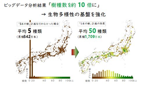 久保田教授が立ち上げた株式会社シンクネイチャーが管理運営する「日本の生物多様性地図化プロジェクト:J-BMP(*3)」を基に、積水ハウス「5本の樹」計画の20年間で植栽した樹木本数・樹種・位置情報の蓄積データを分析し、生物多様性保全や再生に関する定量的な実効性評価を実現しました。