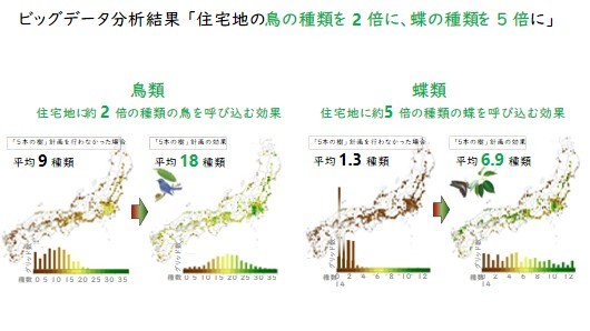 この定量評価により、生物多様性の劣化が著しい都市部(三大都市圏)において、園芸品種や外来樹種などの従来の庭木と比べて「5本の樹」計画に沿った在来樹種を中心に庭木を選定して植樹してきたことで、以下の生物多様性の効果が確認出来ました。(*4)