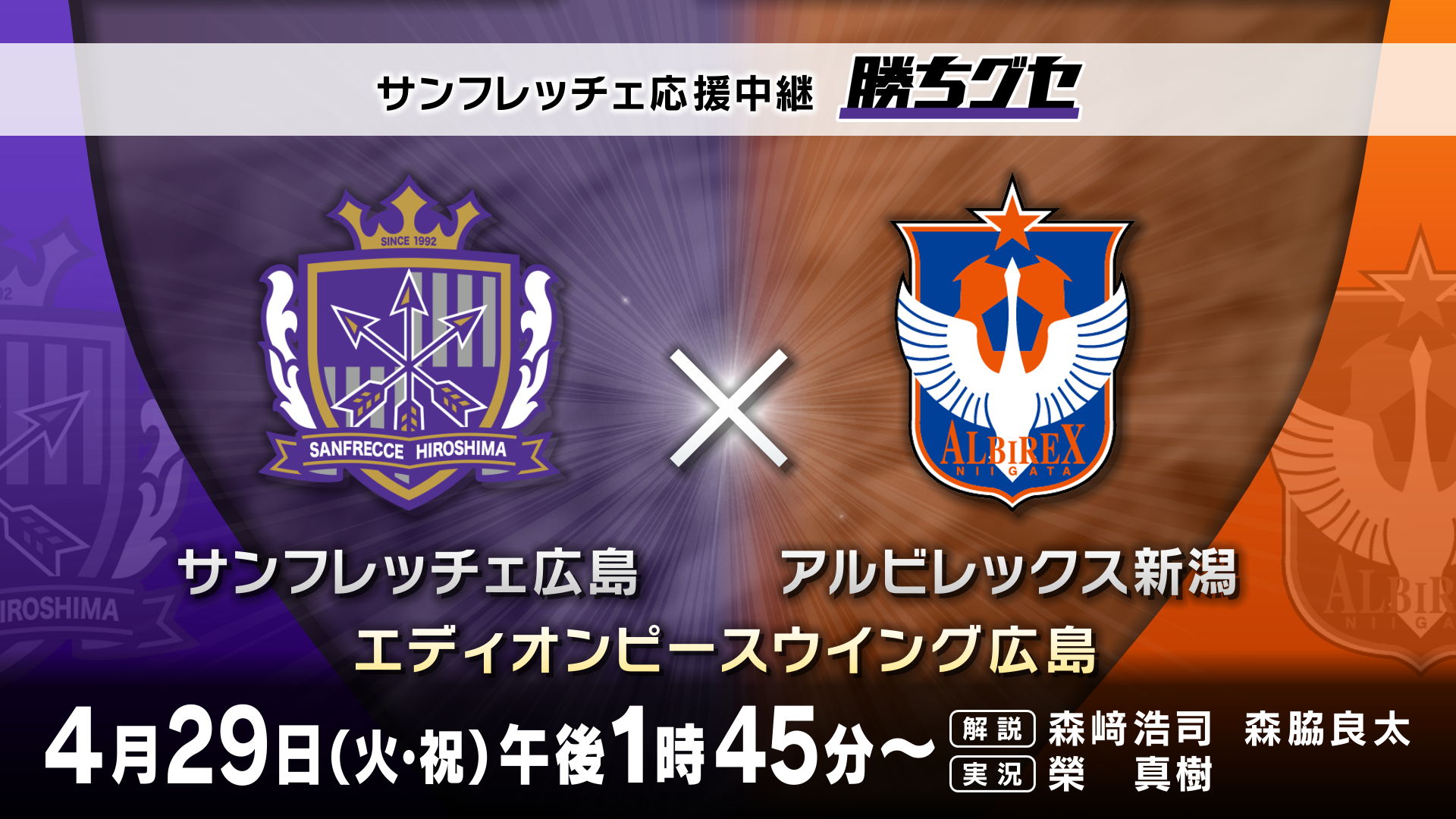 【広島ホームテレビ】4月29日(火・祝) 午後1時45分~ VS 新潟戦
