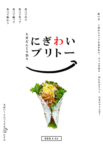 お祭りに合わせて、特別メニューとして「にぎわいブリトー」(商品名)をご用意。ブリトーはトルティーヤ(小麦粉で作られた平たいパン)で包まれた、手軽に持ち運びやすいメキシコ料理で、中に具材が詰まっています。