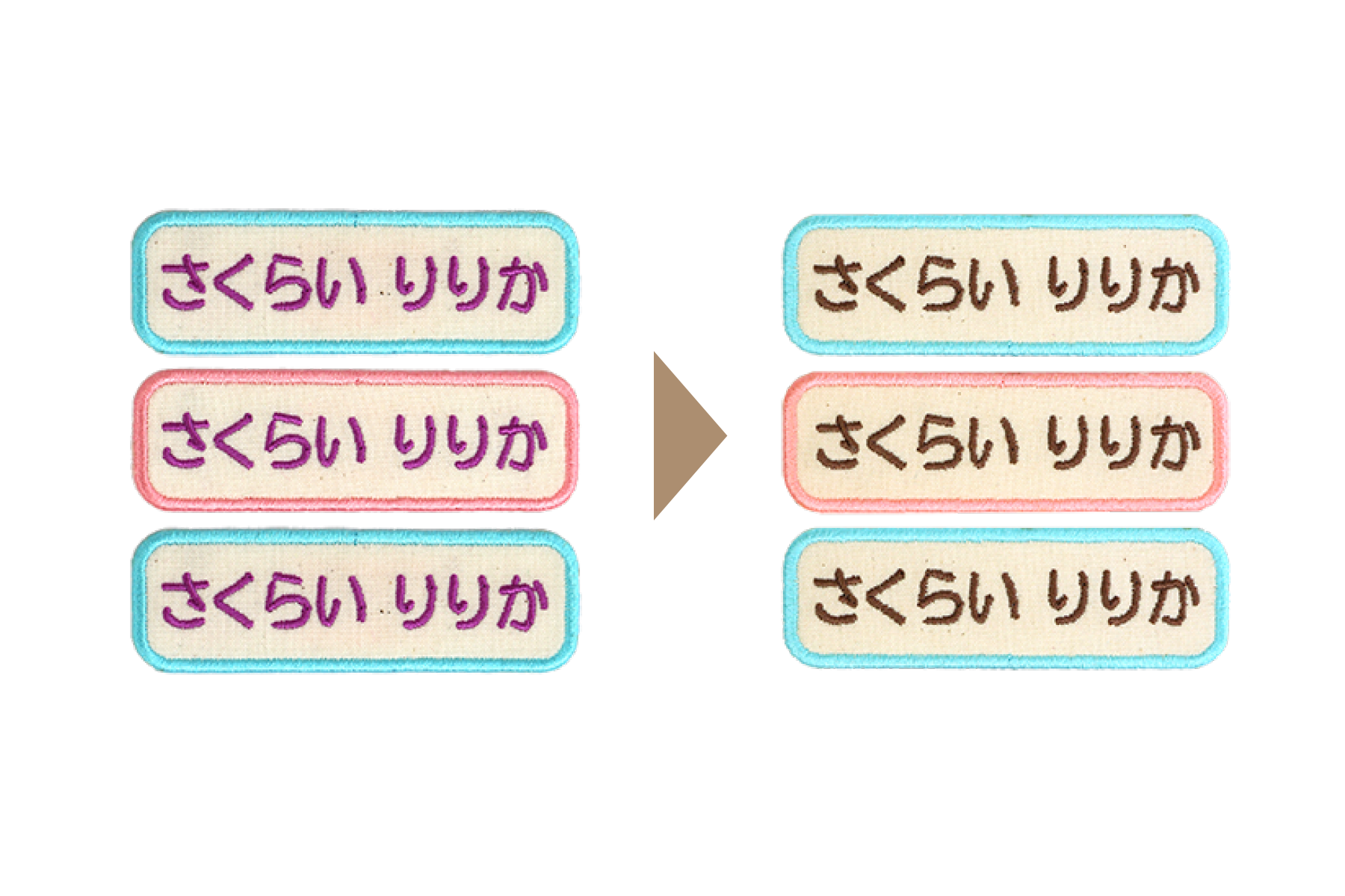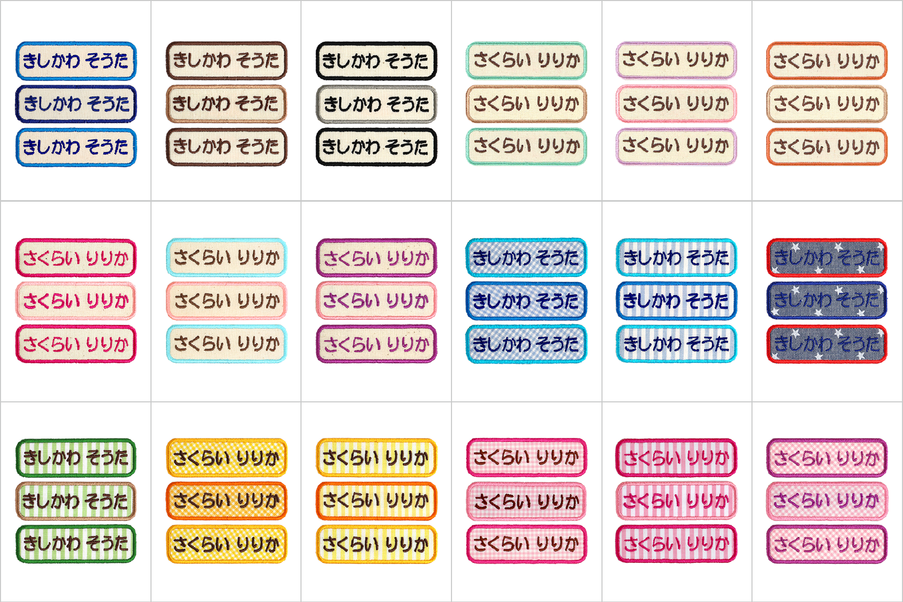 同じ生成生地、パターン生地を使用した、サイズ違いのお名前ワッペンです。