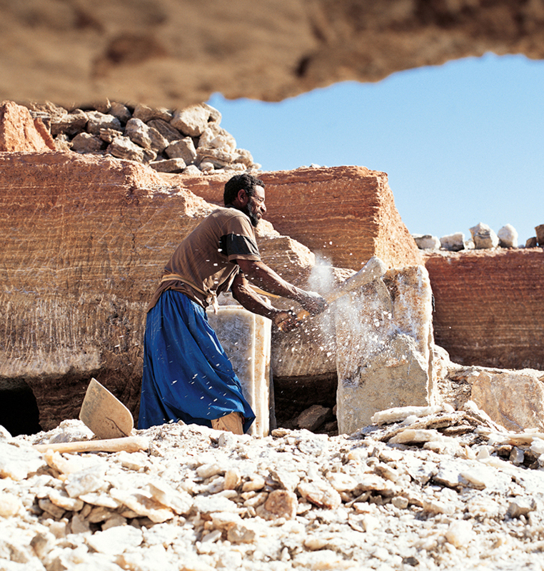 “切り出した厚さ約20cmの岩塩の原石は両面を削り落とし、純度の高い中心4cmを残して塩の板に仕上げる。”