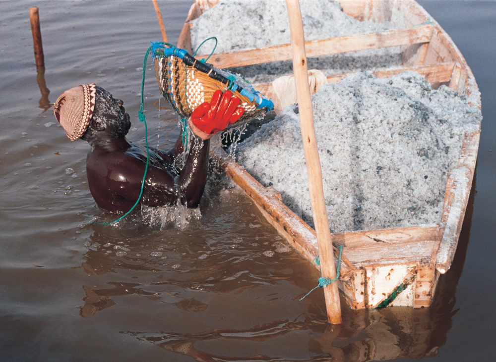“首まで湖に浸かり、足で、湖底に堆積した塩をザルにかき入れる。結んだロープでザルを水面まで引き上げては、塩を船に放り込む。”