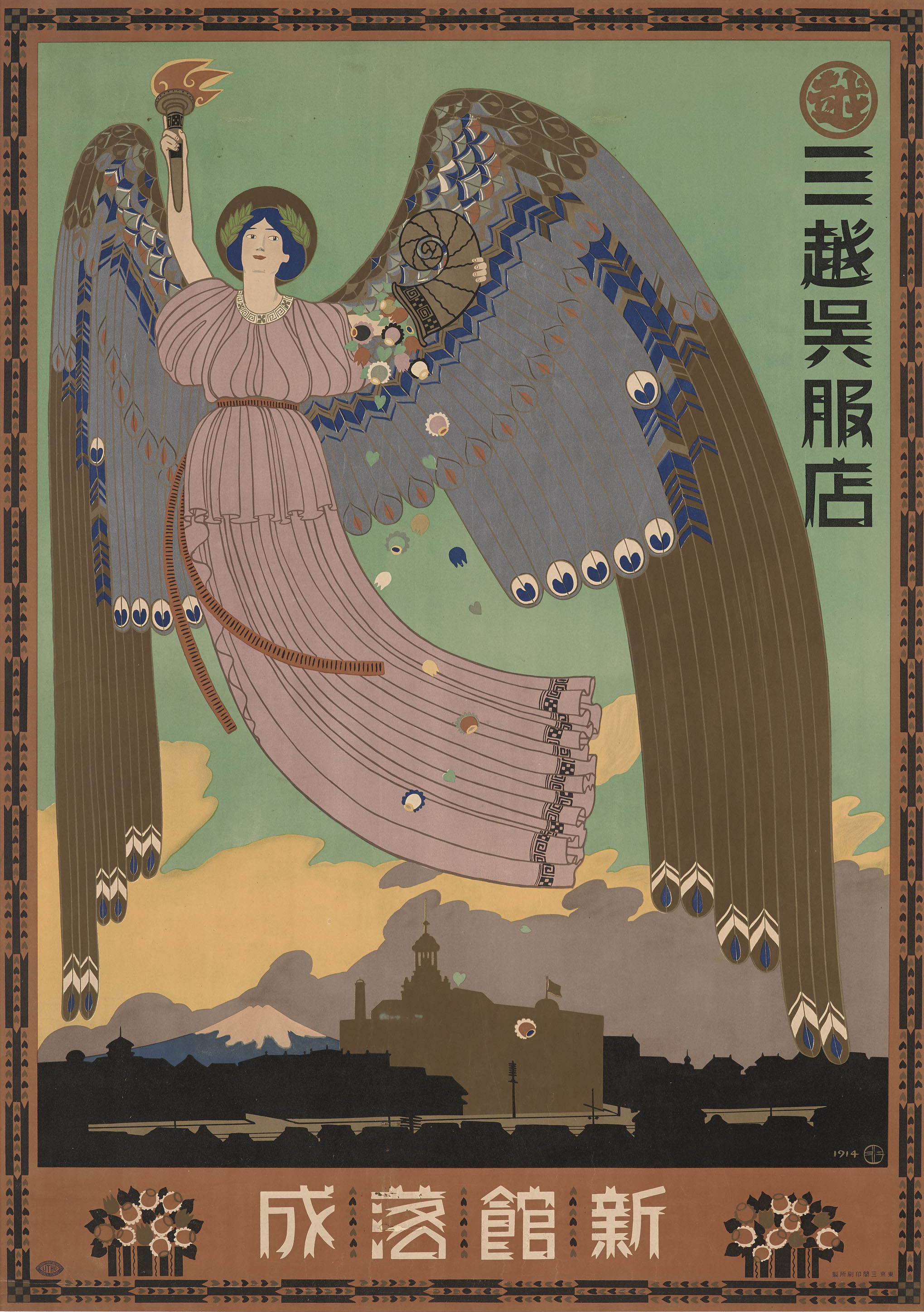 1908年に三越呉服店の嘱託となり、その後図案部初代主任として1934年まで27年間にわたって、同店のポスター・PR誌表紙など様々なデザインを一手に担当しました。また、三越以外の企業デザインや多くの装丁・雑誌表紙なども手がけています。本章では、図案家としての地位を固めていく明治後期から大正期にかけての仕事を見ていきます。
