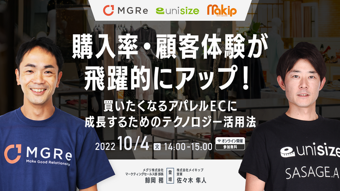 「購入率・顧客体験が飛躍的にアップ!買いたくなるアパレルECに成長するためのテクノロジー活用法」をテーマに、オンラインフィッティングサービス「unisize(ユニサイズ)」を提供する株式会社メイキップと、購入率と顧客体験が飛躍的にアップする秘訣をご紹介いたします!