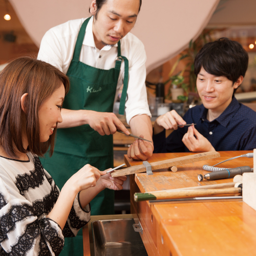 ケイウノ栄店リニューアルにより、5階工房では新たにジュエリーの手作り(DIY)サービスに対応。ふたりで手作りしたジュエリーに、お好きなディズニーキャラクターのマークを入れることができます。