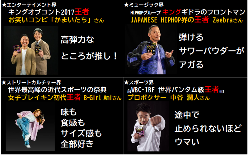 現在、当社内でも『タフグミ』のおいしさを再定義すべく多くの議論を重ねている中で、そのヒントを求めて、エンターテイメント界、ストリートカルチャー界、スポーツ界、ミュージック界の4つの界隈における「タフグミ好き王者」たちが考える“『タフグミ』が王者たるおいしさの理由”を探るWeb-CMを制作しました。